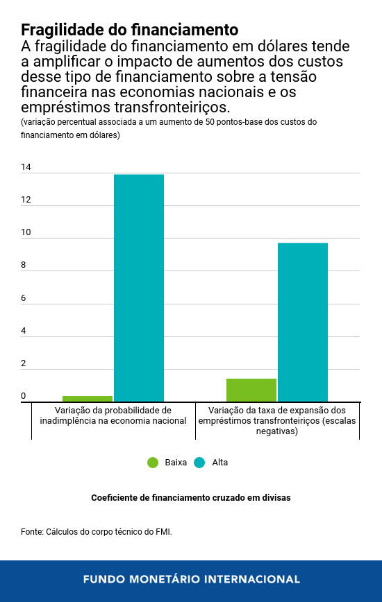 Como a crise demonstrou, um aumento dos custos de financiamento em dólares pode repercutir em todo o sistema financeiro mundial. Em nossa análise, constatamos que custos mais elevados aumentam a probabilidade de inadimplência bancária nas economias de origem de bancos não americanos que dependem do financiamento em dólares. Além disso, aumentam a pressão em países terceiros que recebem empréstimos de bancos não americanos, e os mutuários de mercados emergentes são os mais vulneráveis porque não conseguem encontrar facilmente fontes alternativas de recursos. Ademais, verificamos que a fragilidade do financiamento em dólares pode funcionar como um amplificador, pois esses efeitos negativos são mais pronunciados quando qualquer um dos indicadores apresentados no capítulo do GFSR aponta para um aumento da vulnerabilidade.