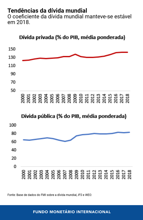 A nova atualização da base de dados do FMI sobre a dívida mundial ( Global Debt Database ) mostra que o total da dívida pública e privada atingiu US$ 188 trilhões no fim de 2018, US$ 3 trilhões a mais do que em 2017. A relação global média entre a dívida e o PIB (ponderada pelo PIB de cada país) subiu ligeiramente para 226% em 2018, 1½ ponto percentual acima do ano anterior. Embora esse tenha sido o menor aumento anual do coeficiente da dívida mundial desde 2004, um exame mais profundo dos dados de cada país revela vulnerabilidades crescentes, sugerindo que muitos países talvez não estejam bem preparados para a próxima fase de contração da atividade econômica.