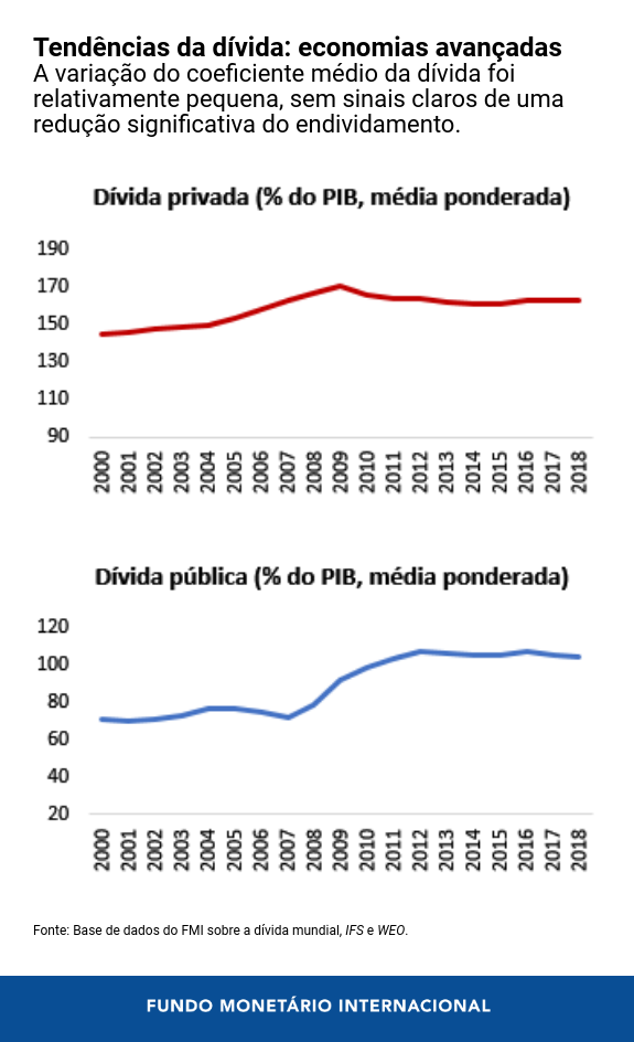 - A evolução da dívida privada, sobretudo das empresas, varia consideravelmente de país para país. Em contraste com a dívida pública, o aumento da dívida privada mundial ao longo da última década tem sido distribuído de forma desigual. Nas economias avançadas, o coeficiente da dívida das empresas vem aumentando gradativamente desde 2010 e já chegou ao mesmo nível de 2008, o pico anterior. Mas há diferenças marcantes. Em algumas das grandes economias, como Espanha e Reino Unido, o setor empresarial eliminou um volume enorme de dívida desde a crise financeira mundial. Nos Estados Unidos, a dívida das empresas cresceu de forma constante desde 2011 e atingiu um nível recorde no fim de 2018. Um padrão comum entre várias economias importantes é o uso crescente da dívida para assumir riscos financeiros (para custear a distribuição de dividendos, a recompra de ações, e fusões e aquisições) e o volume elevado de dívida de grau especulativo . Isso poderia amplificar choques se as empresas ficassem inadimplentes ou decidissem reduzir a dívida cortando investimentos ou demitindo funcionários. Ao mesmo tempo, os coeficientes da dívida das famílias diminuíram nas economias avançadas como um todo em comparação com 2008, com grandes quedas nos Estados Unidos e no Reino Unido e aumentos em um terço das economias avançadas. Nas outras economias de mercados emergentes que não a China, o coeficiente médio da dívida das empresas vem recuando desde 2015 e hoje está 4½ pontos percentuais acima do nível de 2009, mas esses países não estão imunes a uma deterioração da qualidade do crédito de suas empresas. O coeficiente da dívida das famílias tem aumentado de forma constante, mas ainda equivale à metade do nível observado nas economias avançadas.