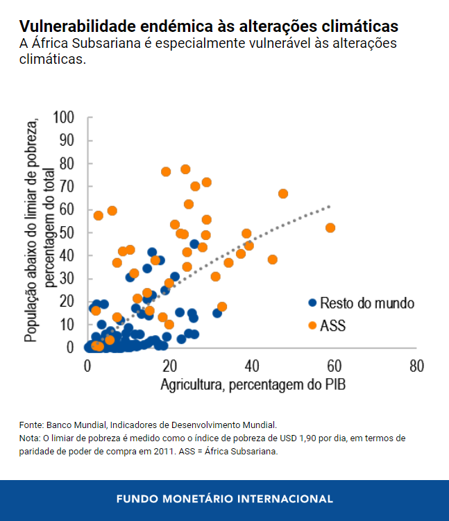 A África Subsariana é particularmente vulnerável às forças das alterações climáticas. Quase metade da população vive abaixo do limiar de pobreza e depende da agricultura irrigada pela chuva, do pastoreio e da pesca para sobreviver . Com cada choque climático, seja seca, inundações ou ciclones, os agricultores sofrem diretamente, ao passo que a escassez faz aumentar o preço dos alimentos para todos.