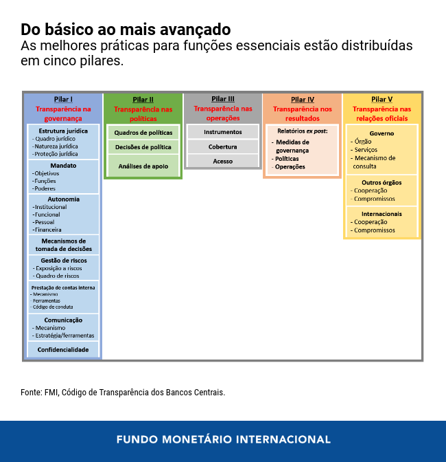O novo código faz parte do foco mais amplo do FMI nas questões de prestação de contas e governança. Sua aplicação é voluntária, e permite aos bancos centrais medir a transparência em cinco áreas-chave ou “pilares”: governança, políticas, operações, resultados e relações oficiais. Cada pilar contém uma lista de melhores práticas “básicas”, “ampliadas” e “avançadas” para funções essenciais, como política monetária ou macroprudencial.