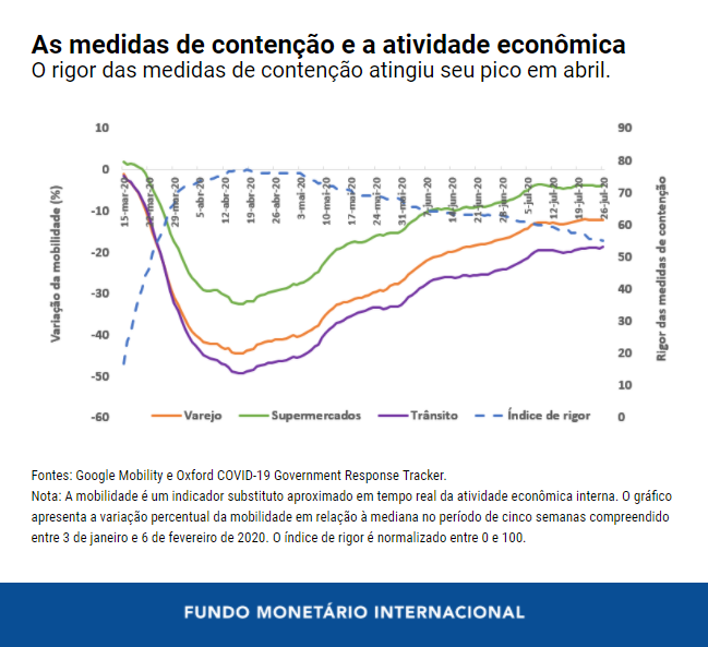 A mobilidade, que serve como indicador representativo da atividade econômica interna, também caiu drasticamente e continuou a recuar à medida que as medidas foram ampliadas e passaram a abranger também o fechamento de locais de trabalho, as quarentenas obrigatórias e as restrições à circulação interna. Entre o fim de abril e o princípio de maio, as medidas de contenção foram relaxadas gradativamente e a mobilidade recuperou-se, embora ainda não tenha voltado aos níveis anteriores à crise.