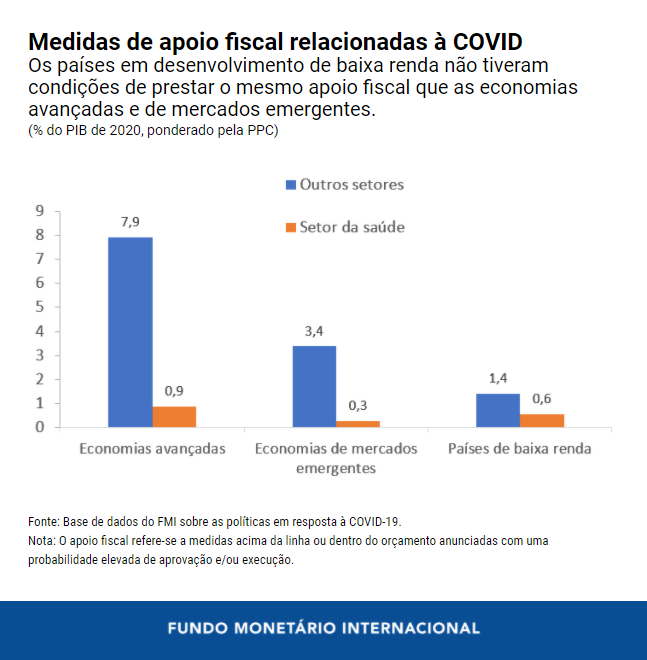 Diante de restrições como essas, a forte concentração das medidas de contenção em um período inicial curto cumpriu um objetivo essencial: achatou a curva de infecção e, ao mesmo tempo, proporcionou tempo para reforçar a capacidade do setor de saúde. Muitos países em desenvolvimento de baixa renda seguiram esse caminho: embora tenham proporcionado menos apoio fiscal a suas economias em comparação com as economias avançadas ou de mercados emergentes, uma proporção maior de seus gastos adicionais foi destinada à saúde.