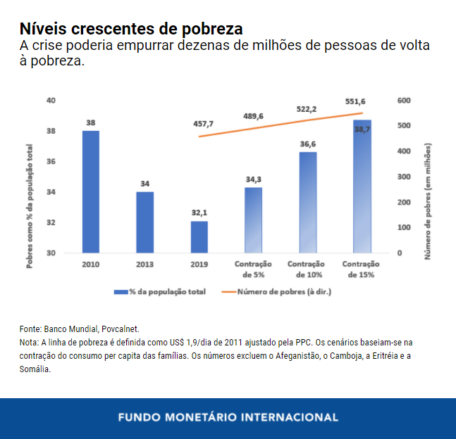 É provável que o crescimento desse grupo de países fique estagnado este ano, em comparação com uma expansão de 5% em 2019. Além disso, a menos que haja um esforço internacional sustentado para apoiá-los, é provável que as cicatrizes permanentes da crise prejudiquem as perspectivas de desenvolvimento, agravem a desigualdade e ponham em risco os frutos de uma década inteira de avanços na redução da pobreza.
