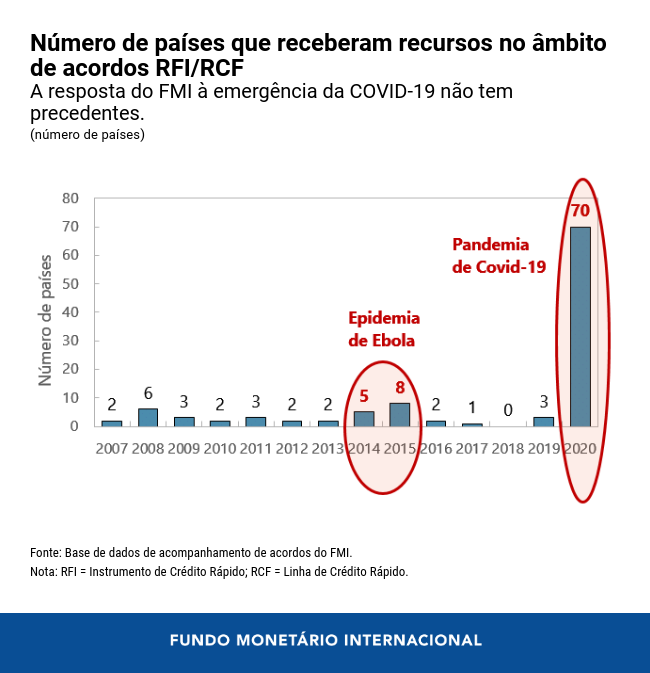 A perda de vidas humanas e as turbulências na economia mundial em decorrência da pandemia de COVID-19 desencadearam uma procura sem precedentes por financiamento. Mais de um terço dos países membros do FMI receberam ajuda da instituição. Desde o início da pandemia, o FMI tem respondido de forma rápida e decisiva para atender a demanda urgente e excepcional de assistência financeira por parte de seus países membros.