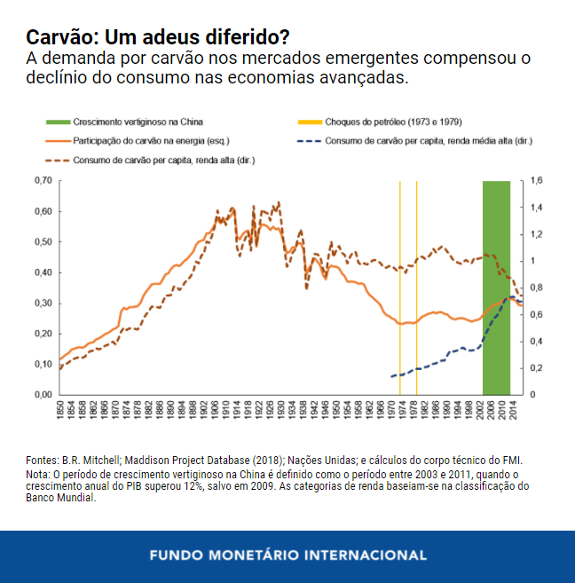 Esse declínio no uso do carvão foi interrompido nos anos 1970 e, em seguida, parcialmente revertido por três fatores: 1) a incerteza em torno da segurança energética, 2) a crescente eletrificação e 3) o rápido crescimento econômico nos mercados emergentes. A necessidade cada vez maior de energia contribuiu para uma retomada da demanda por carvão para a geração de eletricidade em muitas economias avançadas, que também estavam recorrendo novamente ao carvão para reduzir a dependência do petróleo importado. Na virada deste século, o uso do carvão voltou a entrar em declínio nas economias avançadas, mas isso foi mais do que compensado pelo aumento da demanda nos mercados emergentes.