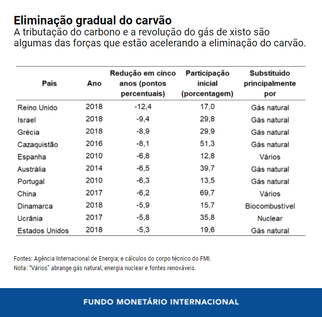 Determinadas condições de mercado e mecanismos de política podem ajudar a superar os obstáculos ao abandono gradual do carvão. Políticas ambientais mais rígidas, a tributação do carbono e fontes de energia substitutas de custo acessível são cruciais. Por exemplo, o regime de precificação do carbono adotado pelo Reino Unido ajudou o país a reduzir em 12, 4 pontos percentuais sua dependência do carvão entre 2013 e 2018. Na Espanha, os subsídios do governo em prol da geração de eletricidade de fontes renováveis ajudaram a reduzir essa dependência entre 2005 e 2010, embora parte dessa redução está relacionada a fatores temporários. Nos Estados Unidos, um declínio mais moderado foi impulsionado pelas forças de mercado, à medida que a revolução do gás de xisto pressionou para baixo os preços do gás natural.