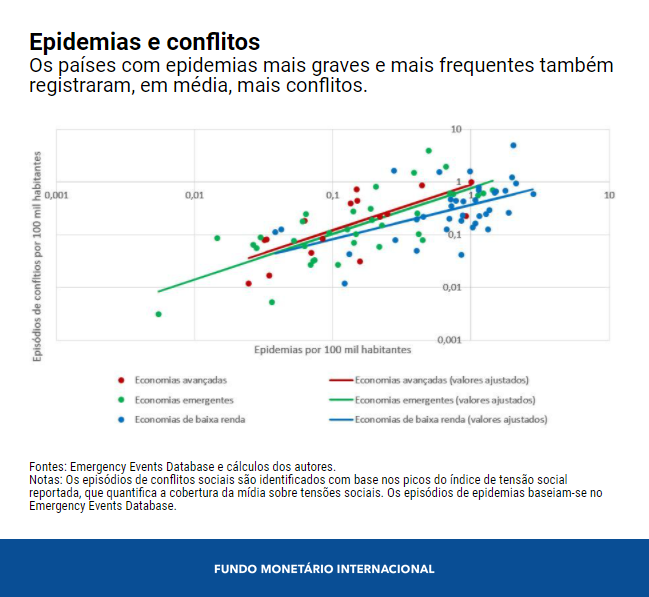 A partir desse índice, o estudo do FMI constatou que os países com epidemias mais graves e mais frequentes também registraram, em média, mais conflitos.