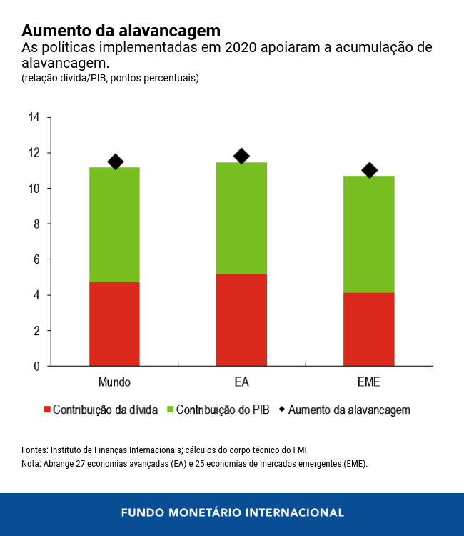 A alavancagem pode ser medida como a relação entre o saldo da dívida e o PIB, uma medida aproximada da capacidade de uma economia de cumprir o serviço da dívida. Mesmo antes da crise da Covid-19, a alavancagem no setor privado não financeiro – famílias e empresas não financeiras – vinha aumentando de forma constante em muitos países. De 2010 a 2019, a alavancagem global desse setor subiu de 138% para 152%, com a alavancagem das empresas atingindo um máximo histórico de 91% do PIB. As condições financeiras brandas na esteira da crise financeira mundial de 2008–09 foram um fator-chave para o aumento da alavancagem.