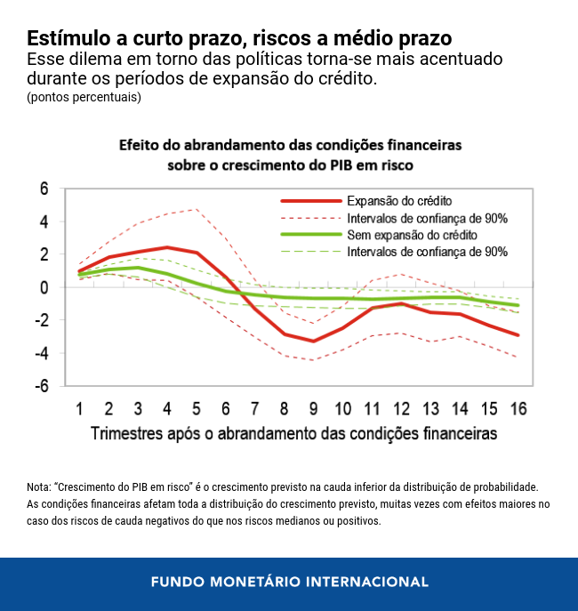 O abrandamento das condições financeiras – quando os investidores reduzem a precificação do risco de crédito – proporciona um impulso à atividade econômica no curto prazo. No entanto, esse abrandamento tem um custo. No médio prazo, a partir de sete a oito trimestres, surge um risco maior de uma retração expressiva. Esse dilema se torna mais acentuado durante os períodos de expansão do crédito. Ou seja, a curto prazo o estímulo é maior, mas a médio prazo os riscos de deterioração também são maiores.