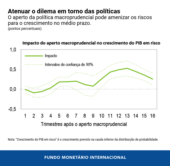 Vale ressaltar que um aperto macroprudencial pode mitigar o risco de deterioração do crescimento, atenuando assim o principal dilema em torno das políticas. Ademais, se as autoridades afrouxarem as condições financeiras por meio da política monetária, mas, ao mesmo tempo, também apertarem as ferramentas macroprudenciais, é possível conter a maior parte dos riscos de deterioração da atividade econômica no médio prazo.