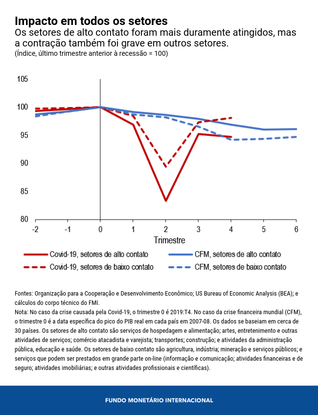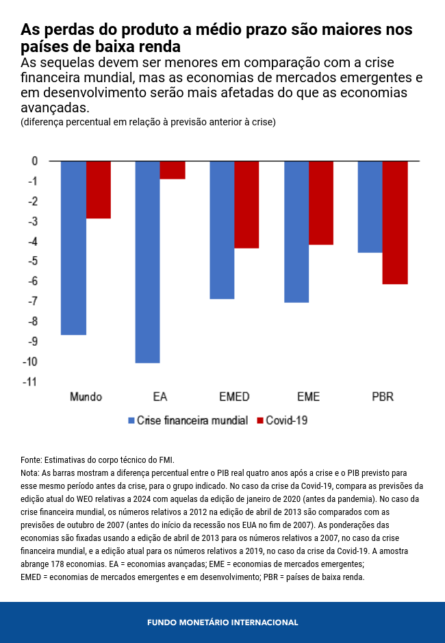 Contudo, ao contrário do que ocorreu durante a crise financeira mundial, as economias de mercados emergentes e em desenvolvimento devem enfrentar sequelas mais profundas em comparação com as economias avançadas, e os países de baixa renda devem sofrer perdas maiores.