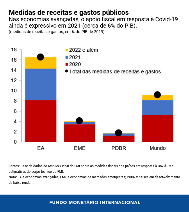Nas economias avançadas, as medidas fiscais têm sido consideráveis e abrangem vários anos (6% do PIB em 2021), como aquelas recém-aprovadas nos Estados Unidos e as apresentadas no orçamento de 2021 do Reino Unido. Nos países de mercados emergentes e em desenvolvimento, o apoio fiscal tem sido mais limitado devido às restrições de financiamento, mas a elevação dos déficits ainda é notável, uma vez que a arrecadação caiu. A média dos déficits fiscais globais como parcela do PIB em 2020 chegou a 11,7% nas economias avançadas, 9,8% nas economias de mercados emergentes e 5,5% nos países em desenvolvimento de baixa renda.