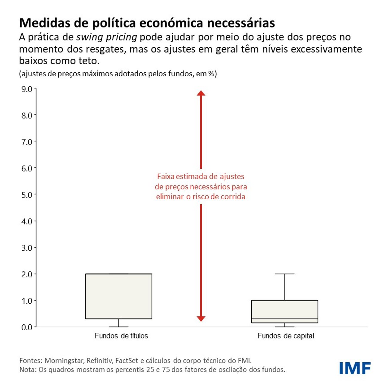 Os ajustes que os fundos podem fazer nos preços de fim de dia – conhecidos como fatores de oscilação – geralmente têm níveis insuficientes como teto, sobretudo em períodos de tensão nos mercados. Portanto, as autoridades econômicas precisam oferecer orientação sobre a calibragem desses mecanismos e o acompanhamento de sua aplicação.