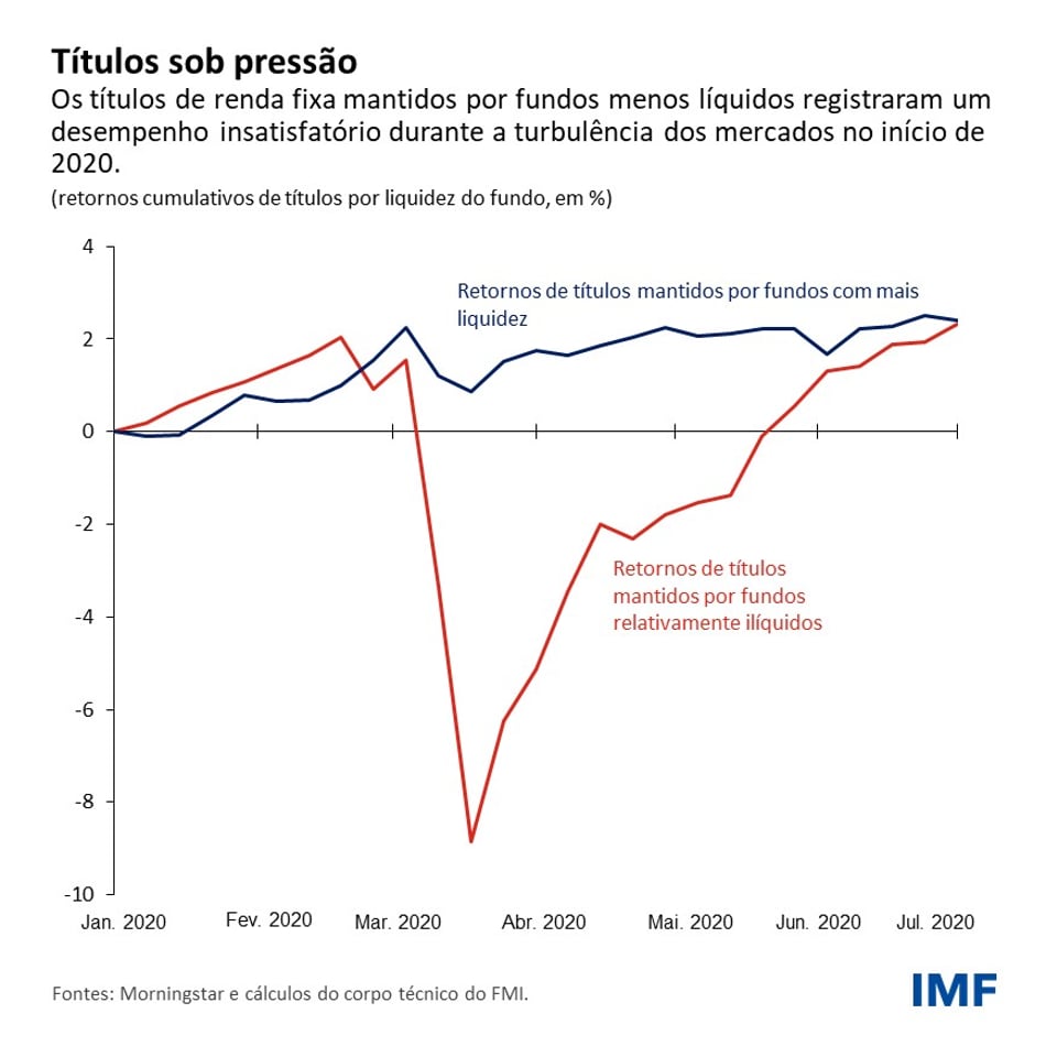 Essa provavelmente foi a dinâmica que testemunhamos durante o período de turbulência dos mercados no início da pandemia, conforme mencionado num capítulo analítico do Relatório sobre a Estabilidade Financeira Mundial. Os fundos abertos se viram obrigados a vender ativos em meio a saques de cerca de 5% de seu patrimônio total, que foram superiores aos resgates na crise financeira global ocorrida uma década e meia antes.