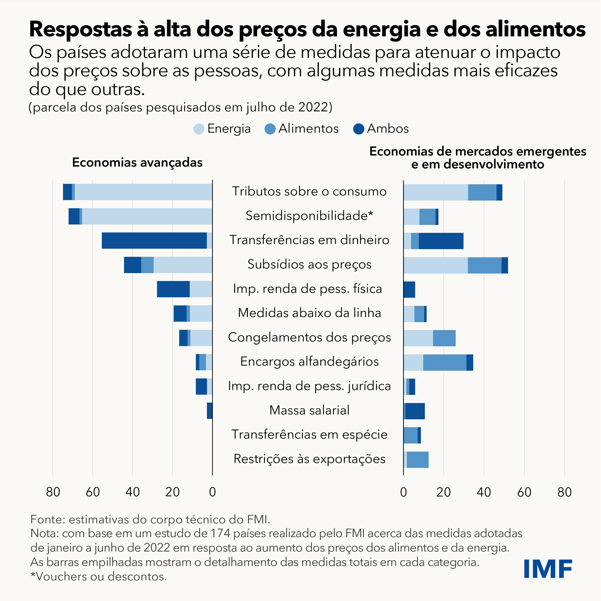 Os preços dos alimentos aumentaram 50% desde 2019 e as perturbações na oferta persistiram nos mercados de alimentos e de energia. A alta dos preços ameaça o padrão de vida das pessoas por toda parte, levando os governos a adotar uma série de medidas fiscais, inclusive subsídios a preços, cortes de impostos e transferências de renda. Estimamos o custo fiscal médio dessas medidas em 0,6% do produto interno bruto nacional, além dos subsídios pré-existentes, entre os países para os quais havia estimativas disponíveis.