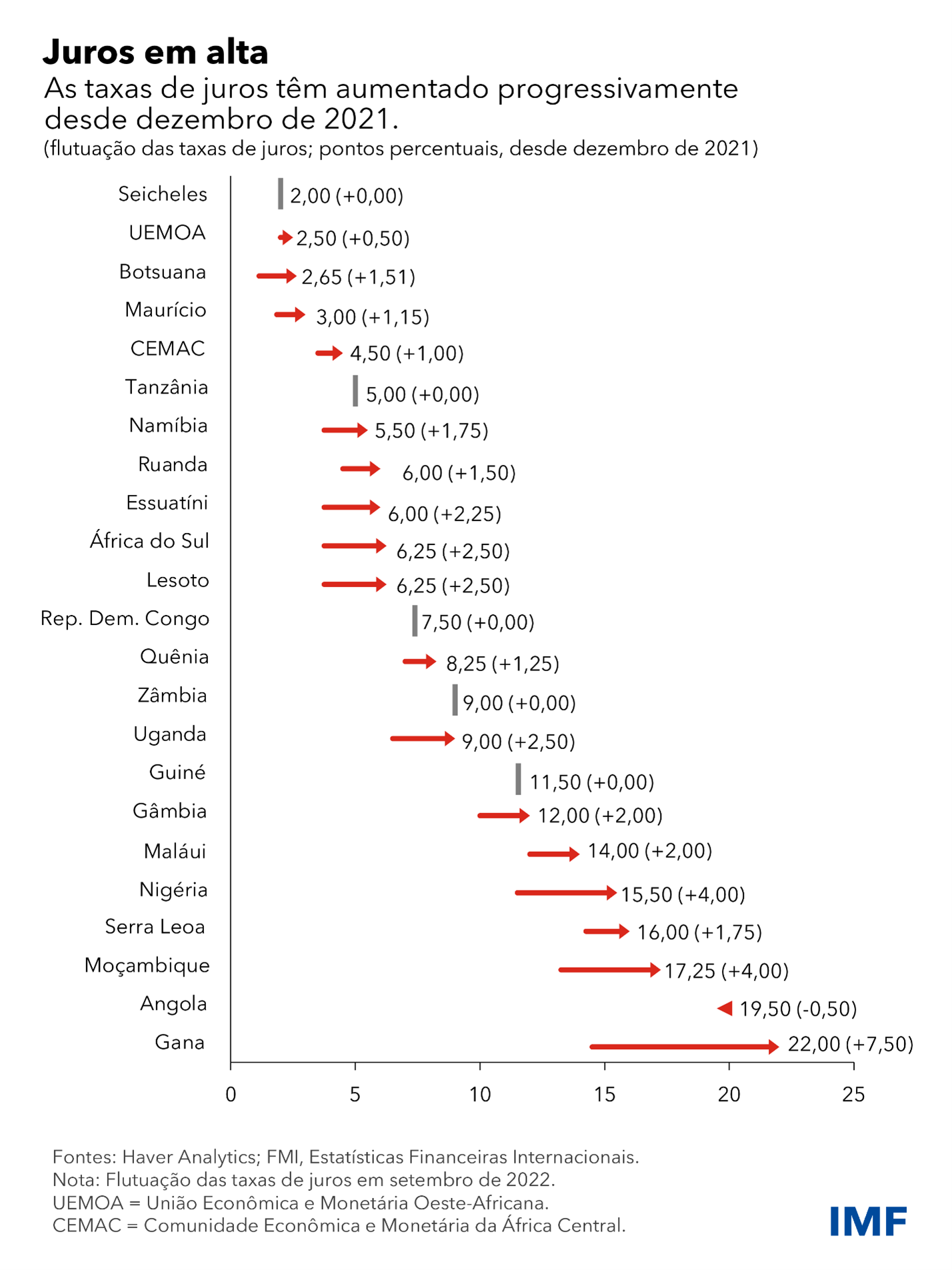 Os bancos centrais de região já começaram a aumentar os juros em reação à alta da inflação, bem como à fuga de capitais e à desvalorização de suas moedas resultantes do aperto da política monetária nas economias avançadas. Como exemplo, podemos citar Gana, Malavi, Moçambique, Nigéria, Uganda e as uniões econômicas e monetárias da África Central e da África Ocidental.
