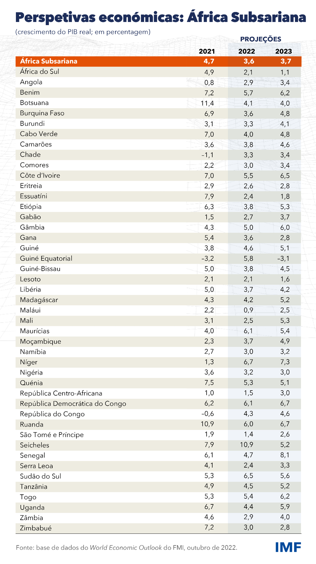 A África Subsaariana enfrenta um dos ambientes econômicos mais desafiadores em anos, marcado por uma recuperação lenta da pandemia, aumento nos preços dos alimentos e da energia e níveis elevados de dívida pública. Uma das questões mais prementes enfrentadas pela região é a necessidade de combater os níveis mais elevados de inflação em décadas — que são devastadores para a renda e a segurança alimentar — e, ao mesmo tempo, sustentar o crescimento econômico.