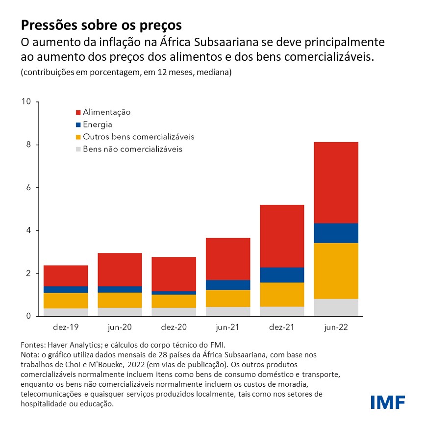 Na África Subsaariana, a inflação tem sido estimulada menos pela atividade interna do que nas economias avançadas. Ao contrário, os desdobramentos externos moldaram a trajetória da inflação desde o início da pandemia. Eles incluem a forte alta no preço das commodities globais, oscilações na taxa de câmbio, interrupções na cadeia de suprimentos e desastres naturais.