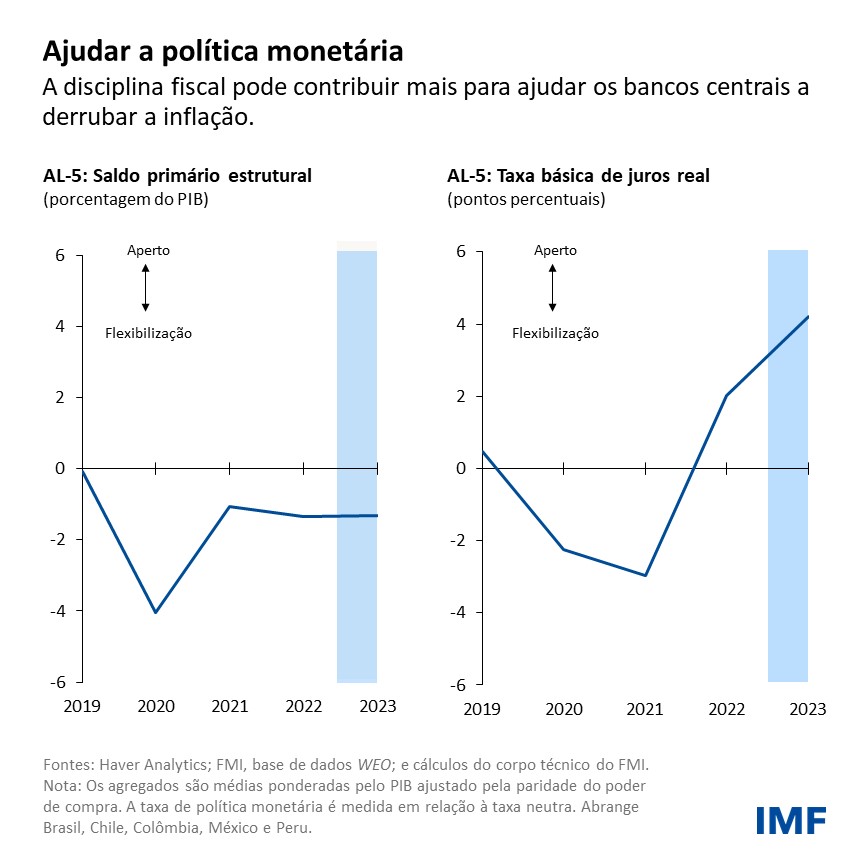 A política fiscal poderia ajudar mais os bancos centrais no combate à inflação se seguisse uma orientação mais anticíclica neste ano. Como mostra um estudo recente do FMI, apertos fiscais possibilitam que os bancos centrais elevem menos os juros para baixar a inflação.