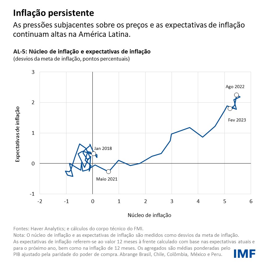 Após chegar a 10% em meados de 2022, a inflação ao consumidor nas maiores economias da América Latina caiu para 7% em março. No entanto, essa queda reflete principalmente a redução dos preços das commodities em relação aos seus picos. O avanço obtido na redução do núcleo de inflação, que exclui preços de energia e alimentos, parece ter estagnado. Há uma escassez de oferta nos mercados de trabalho, e o emprego segue firme, acima dos níveis anteriores à pandemia. Ao mesmo tempo, o produto está no seu potencial ou acima dele, e as expectativas de inflação de curto prazo estão acima das metas dos bancos centrais. A forte demanda interna, os rápidos aumentos dos salários e as pressões amplas sobre os preços apontam para o risco de que a inflação na região permaneça num nível alto e inaceitável.