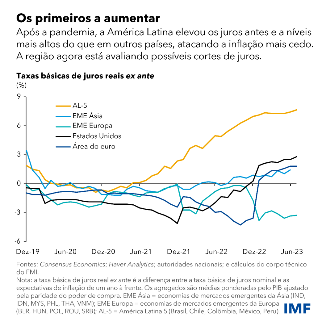 De fato, diante do maior pico inflacionário desde a adoção do regime de metas de inflação, os países da região agiram com excepcional rapidez, elevando os juros mais cedo e a níveis mais altos do que em outros países. Agora, a inflação está recuando, as moedas se valorizaram nos últimos meses e a discussão atual é sobre o ritmo dos futuros cortes nos juros, que alguns países já iniciaram. Em contrapartida, em outras regiões, ainda se discutem novos aumentos.