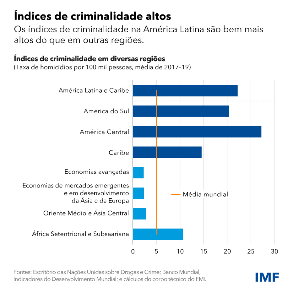 A taxa média de homicídios na região é dez vezes maior do que a de outras economias de mercados emergentes e em desenvolvimento e duas vezes maior que a da África Subsaariana. Na região, a América Central se destaca como a sub-região mais violenta. A insegurança também vem piorando com o passar do tempo, sobretudo em algumas partes da região. Por exemplo, a América Central e o Caribe tiveram aumentos anuais das taxas de homicídio de cerca de 4% nas últimas duas décadas.
