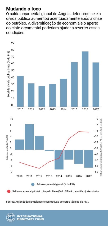 As políticas no período que antecedeu as eleições de Agosto de 2017 — expansão orçamental e taxa de câmbio fixa — levaram a uma erosão ainda maior dos amortecedores orçamentais e externos. O défice orçamental global piorou, chegando a 6% do PIB, e a dívida pública inclundo a dívida da petrolífera estatal Sonangol, alcançou 64% do PIB em 2017. As reservas internacionais brutas caíram para $ 17¾ mil milhões — o equivalente a seis meses de importações — enquanto o diferencial entre a taxa de câmbio paralela e a oficial subiu para 150% em 2017.