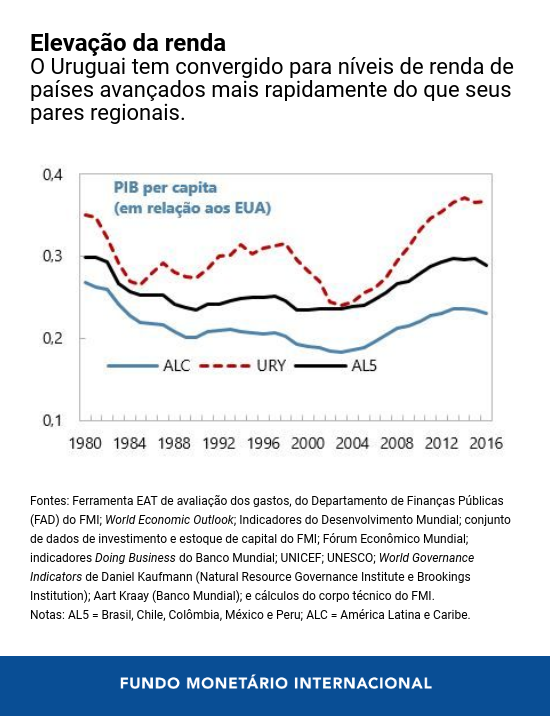 2. Instituições sólidasPara superar o ambiente externo menos favorável, será necessário manter o histórico positivo do Uruguai, construído sobre instituições sólidas e políticas econômicas prudentes. Por ser uma pequena economia aberta, o Uruguai é vulnerável a mudanças no sentimento dos mercados mundiais e a repercussões regionais. Políticas econômicas criteriosas – como a diversificação das exportações e destinos, tendo a China como um importante parceiro comercial – ajudaram o país a resistir a choques regionais. No futuro, o governo deve aproveitar as vantagens institucionais do Uruguai para melhorar os quadros de política fiscal e monetária e implementar novas reformas para fortalecer os resultados da educação, a competitividade e o investimento do setor privado, de modo a salvaguardar os ganhos sociais da última década e apoiar o crescimento.