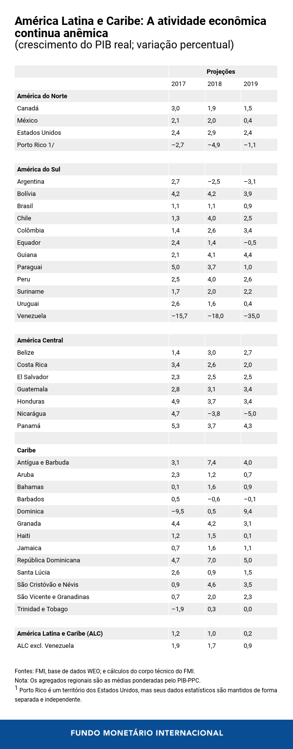 O crescimento da América Latina e do Caribe está desacelerando. Espera-se que a região cresça 0,2% este ano, em meio a tensões comerciais contínuas, crescimento mundial mais lento, preços moderados das commodities e uma alta incerteza política em algumas grandes economias regionais. Para impulsionar a recuperação econômica e criar mais empregos, a região dependerá de fatores internos de crescimento, como o consumo e o investimento, de acordo com a última edição da publicação Perspectivas econômicas: As Américas, do FMI.