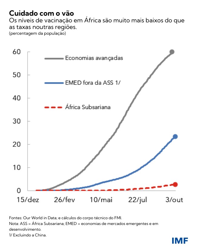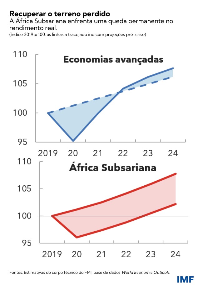 - A esperada recuperação é mais lenta do que noutras regiões, aumentando as divergências. As diferenças nas taxas de crescimento entre regiões deverão se manter a médio prazo, a meio a disparidades mundiais persistentes no acesso às vacinas e diferenças acentuadas na disponibilidade de apoio de políticas. Espera-se que as economias avançadas regressem à trajetória pré-crise até 2023. Em contrapartida, irá demorar para a África Subsariana recuperar o terreno perdido. Para igualar o tipo de recuperação observada nas economias avançadas, a região teria de crescer duas vezes mais depressa nos próximos três anos.