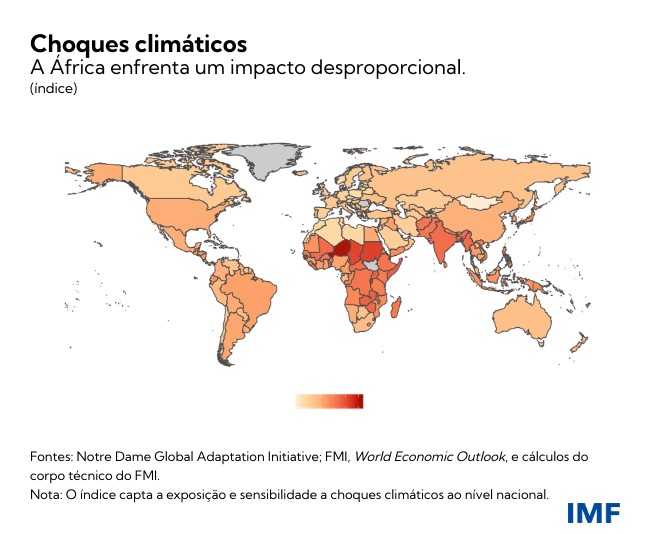 - A África Subsariana é a região do mundo que menos contribui com emissões de gases com efeito de estufa – menos de 5% das emissões mundiais – mas é talvez a mais vulnerável aos choques climáticos. Um terço das secas do mundo já ocorre na África Subsariana e a sua dependência da agricultura pluvial torna-a particularmente vulnerável. As alterações climáticas podem também atuar como um multiplicador de conflitos e fragilidades, agravando tensões preexistentes, má governação e outras preocupações socioeconómicas. A adaptação às alterações climáticas e a ajuda aos esforços de atenuação ao nível mundial, exigirão novos e robustos mecanismos de financiamento climático.