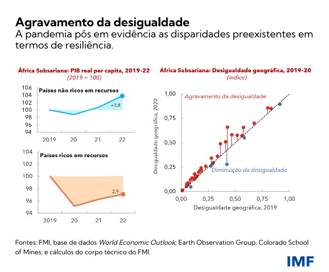 - A pandemia também agravou as divergências preexistentes entre países da África Subsariana e dentro de cada país. Mesmo antes da pandemia, os países não ricos em recursos que têm uma estrutura económica diversificada estavam a crescer mais rapidamente do que os ricos em recursos. Mas esta brecha foi exacerbada pela pandemia, que pôs em evidência as principais disparidades em termos de resiliência.