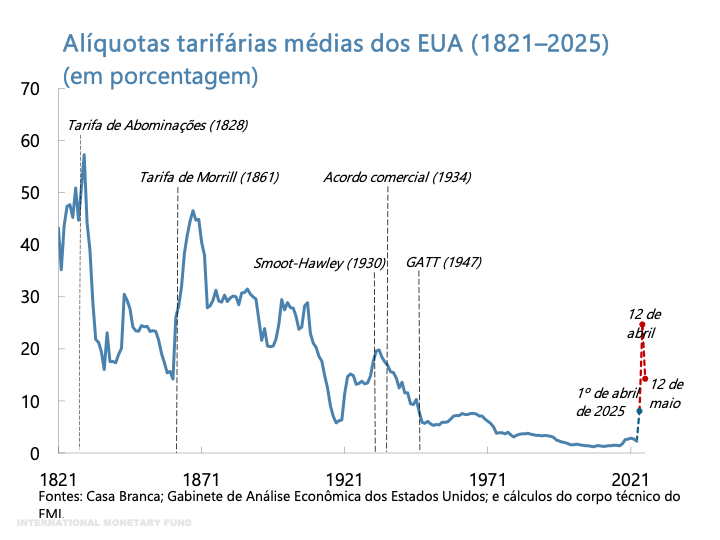 Contudo, o cenário agora é outro. Grandes mudanças em matéria de política econômica sinalizaram uma redefinição do sistema de comércio mundial. No início de abril, a alíquota tarifária efetiva dos EUA saltou para níveis que não eram vistos havia um século (Figura).