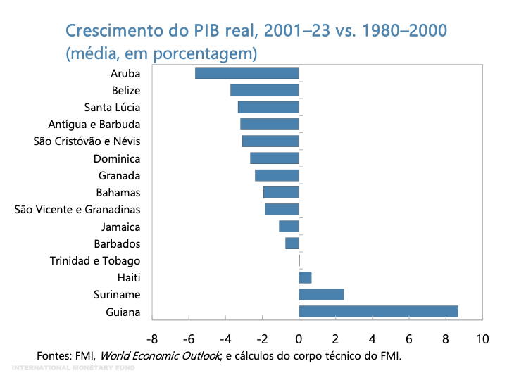 A desaceleração do crescimento é um fenômeno relativamente recente do ponto de vista global, mas, infelizmente, não é novidade para o Caribe. As tendências de declínio do crescimento na região já estão presentes também em um horizonte mais longo. Uma análise recente do FMI constata que a maioria dos países do Caribe teve um crescimento consideravelmente mais lento nas últimas décadas (2001–2023), em comparação com as duas décadas anteriores (1980–2000).