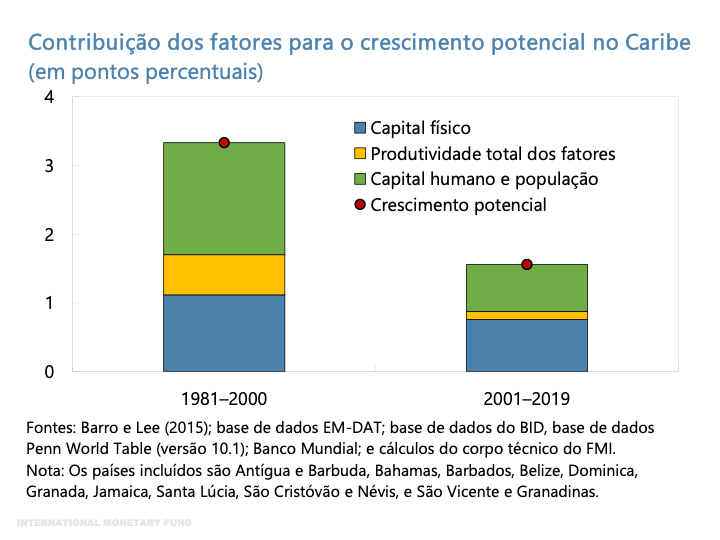 No caso das economias caribenhas dependentes do turismo, estimamos um declínio do crescimento potencial de 3,3% no período 1981–2000 para 1,6% nas duas décadas seguintes (2001–2019).