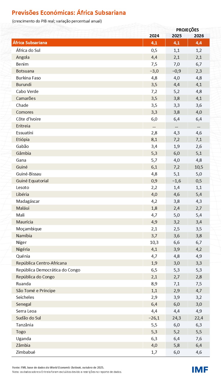 O crescimento económico da África Subsariana deverá, segundo as projeções, manter-se estável em 4,1% em 2025, registando uma ligeira aceleração em 2026, apoiada pela estabilização macroeconómica e por esforços de reformas em economias importantes. No entanto, essa resiliência não pode ser dada como garantida.