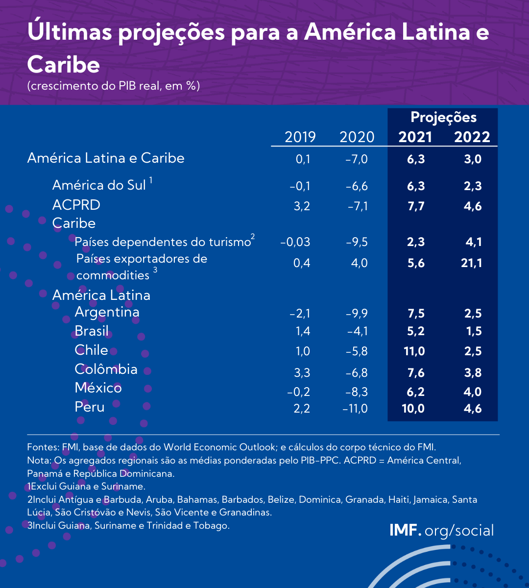 A recuperação econômica da América Latina e Caribe (ALC) está em curso, mas a pandemia ainda lança uma sombra sobre grande parte da região. A recuperação foi robusta no primeiro trimestre de 2021, mas perdeu força em alguns países no segundo trimestre, refletindo o novo aumento dos casos de Covid-19. O PIB real deve crescer 6,3% em 2021, seguido de um crescimento mais moderado de 3% em 2022, mas não alcançaria as tendências anteriores à pandemia no médio prazo, uma vez que fragilidades persistentes nos mercados de trabalho criam riscos de sequelas econômicas.