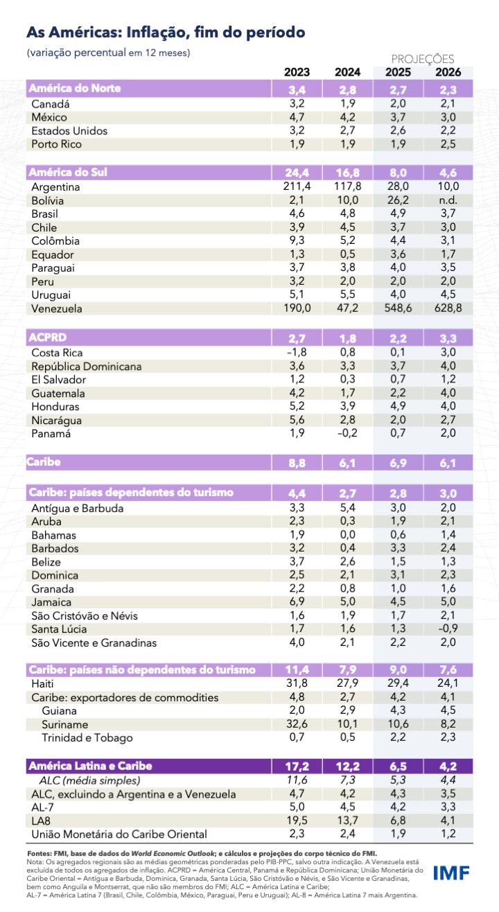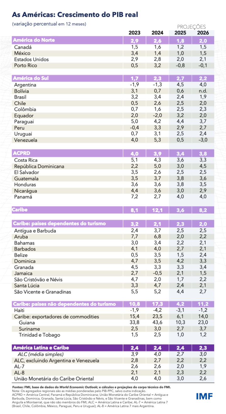 O crescimento na América Latina e no Caribe deve permanecer estável em 2025 e moderar-se ligeiramente no próximo ano. A convergência da inflação para as metas continua, embora a um ritmo mais lento. O aumento contínuo da dívida pública salienta a necessidade de consolidação fiscal.