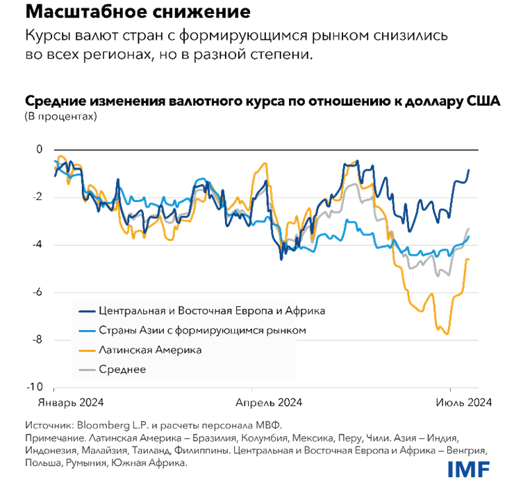 Страны, в которых сокращение было наиболее выраженным, в частности, некоторые страны Латинской Америки, которые в этом году понизили директивные ставки вследствие замедления инфляции, или страны с наиболее низким уровнем дифференциала процентных ставок, включая некоторые страны Азии с формирующимся рынком, испытали наибольшее снижение обменного курса по отношению к доллару. Свою роль могут играть и другие характерные длястран факторы, такие как бюджетные проблемы или политические события. Ряд центральных банков стран с формирующимся рынком замедлили илиприостановили циклы повышения ставок, или провели валютные интервенции для сдерживания волатильности валютного курса.