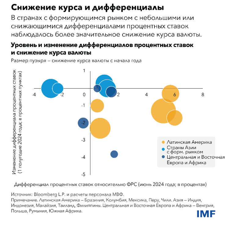 Ключевым фактором, определяющим валютные курсы, является разница впроцентных ставках между данной страной и США — это ориентир на мировых рынках капитала. В начале этого года инвесторы ожидали, что Федеральная резервная система значительно снизит процентные ставки, в связи с чем дифференциал процентных ставок со странами с формирующимся рынком увеличится или, по крайней мере, не изменится. Поскольку экономика США оказалась сильнее, чем ожидалось ранее, а инфляция еще не достигла целевого показателя ФРС, ожидания снижения процентных ставок в США в течение года рассеялись, а доллар укрепился. В результате в основных странах сформирующимся рынком разница в процентных ставках по отношению к США сократилась.