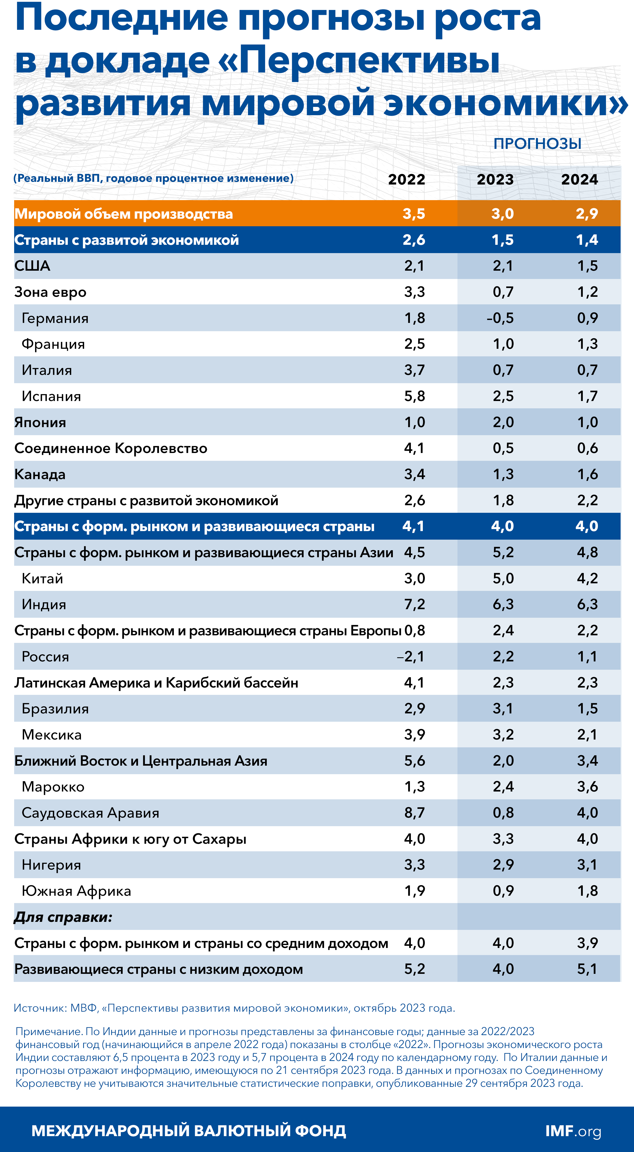 Согласно базовому прогнозу, рост мировой экономики замедлится с 3,5 процента в 2022 году до 3,0 процента в 2023 году и 2,9 процента в 2024 году, что существенно ниже среднего значения за прошлые периоды (2000–2019 годы) в 3,8 процента. В странах с развитой экономикой ожидается замедление с 2,6 процента в 2022 году до 1,5 процента в 2023 году и 1,4 процента в 2024 году по мере того, как начнет сказываться ужесточение политики. В странах с формирующимся рынком и развивающихся странах прогнозируется небольшое снижение роста с 4,1 процента в 2022 году до 4,0 процента в 2023 и 2024 году. По прогнозу, инфляция в мире будет неуклонно снижаться с 8,7 процента в 2022 году до 6,9 процента в 2023 году и 5,8 процента в 2024 году ввиду ужесточения денежно-кредитной политики, а также снижения международных цен на сырьевые товары. В целом прогнозируется, что базовая инфляция будет снижаться более постепенно, и, как ожидается, в большинстве случаев инфляция не вернется к целевому показателю до 2025 года.