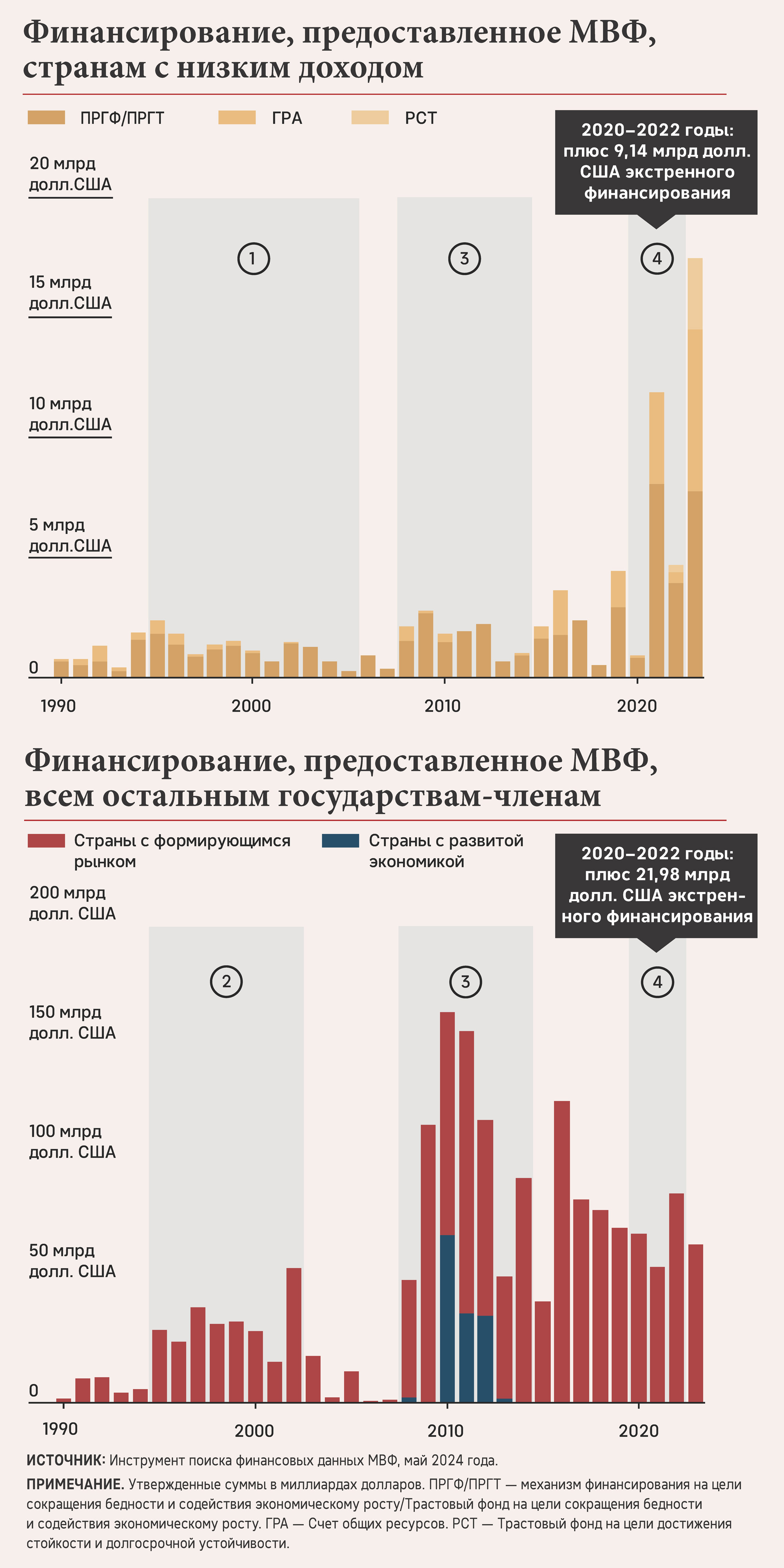 Однако за последние 30 лет темпы изменений ускорились. В ответ на финансовые кризисы МВФ не только активизировал кредитование (см. графики ниже), но и расширял свои наборы инструментов для предотвращения и урегулирования кризисов. Изменения глобальных экономических условий и новые образы мышления также привели к многочисленным реформам. Например, после десятилетия вялого роста в странах с низким доходом в середине 1990-х годов МВФ переориентировал свой подход, сделав приоритетной задачей экономический рост и сокращение бедности. В середине 2000-х годов возникли глобальные дисбалансы, и МВФ пересмотрел свою систему надзора и разработал новые инструменты для более точной оценки обменных курсов и достаточности резервов.