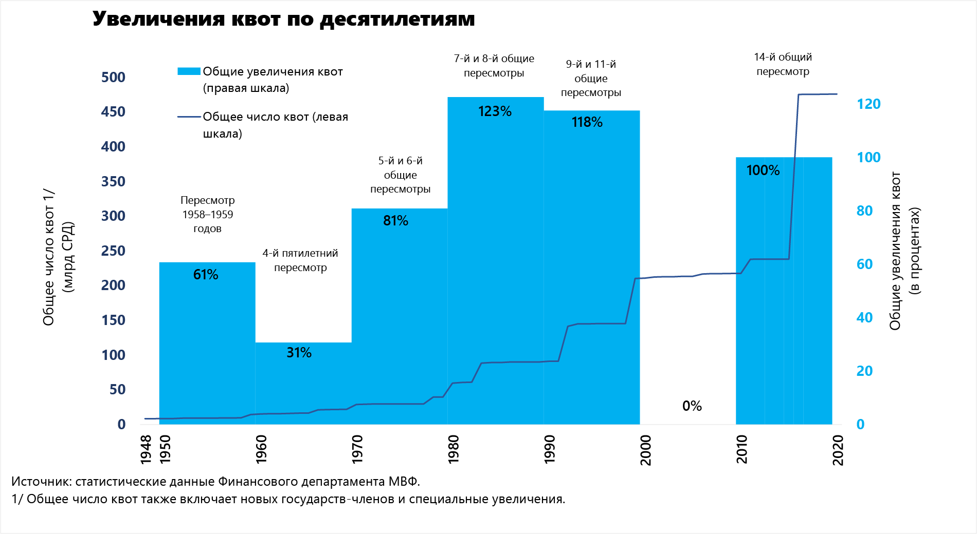 Совет управляющих МВФ проводит общий пересмотр квот не реже чем раз в пять лет. При общем пересмотре квот решается два главных вопроса: размер общего увеличения квот и распределение этого увеличения между государствами-членами.