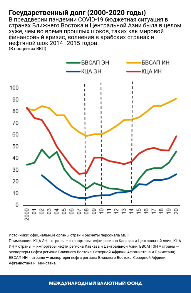 Например, резкое снижение спроса и цен на нефть, на котором основан наш прогноз роста на уровне, –6,6 процентов в 2020 году для стран — экспортеров нефти в регионе Ближнего Востока, Северной Африки, Афганистана и Пакистана (БВСАП). Или возьмем ущерб, нанесенный сфере торговли и туризма, который по большей части нивелирует выгоды от низких цен на нефть в странах — импортерах нефти БВСАП, из-за чего рост в этих странах прогнозируется на уровне –1 процент. Пострадал и регион Кавказа и Центральной Азии, где в 2020 году прогнозируется сокращение экономики в размере –2,1 процента вследствие значительного замедления экономического роста в странах — импортерах нефти региона.