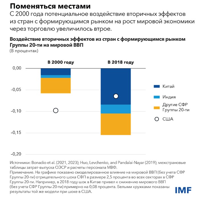 Вторичные эффекты для роста вследствие внутренних шоков в странах с формирующимся рынком Группы 20‑ти за последние два десятилетия увеличились ивнастоящее время сопоставимы с показателями стран с развитой экономикой, очем мы подробно рассказываем в аналитической главе апрельского выпуска доклада «Перспективы развития мировой экономики» 2024 года. Мы также исследуем, как такие шоки распространяются через торговлю на компании иотрасли в других странах.