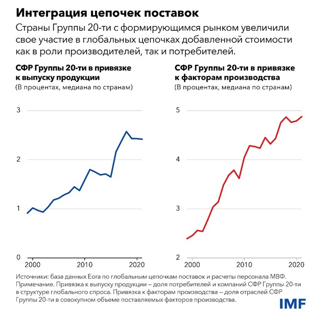 Негативные вторичные эффекты от замедления темпов роста в странах с формирующимся рынком Группы 20-ти, особенно после шоков со стороны предложения, могут поставить под угрозу снижение инфляции в странах с развитой экономикой. В других странах с формирующимся рынком и развивающихся странах вторичные эффекты могут быть более значительными, что ставит под угрозу экономический рост и сближение уровня доходов.