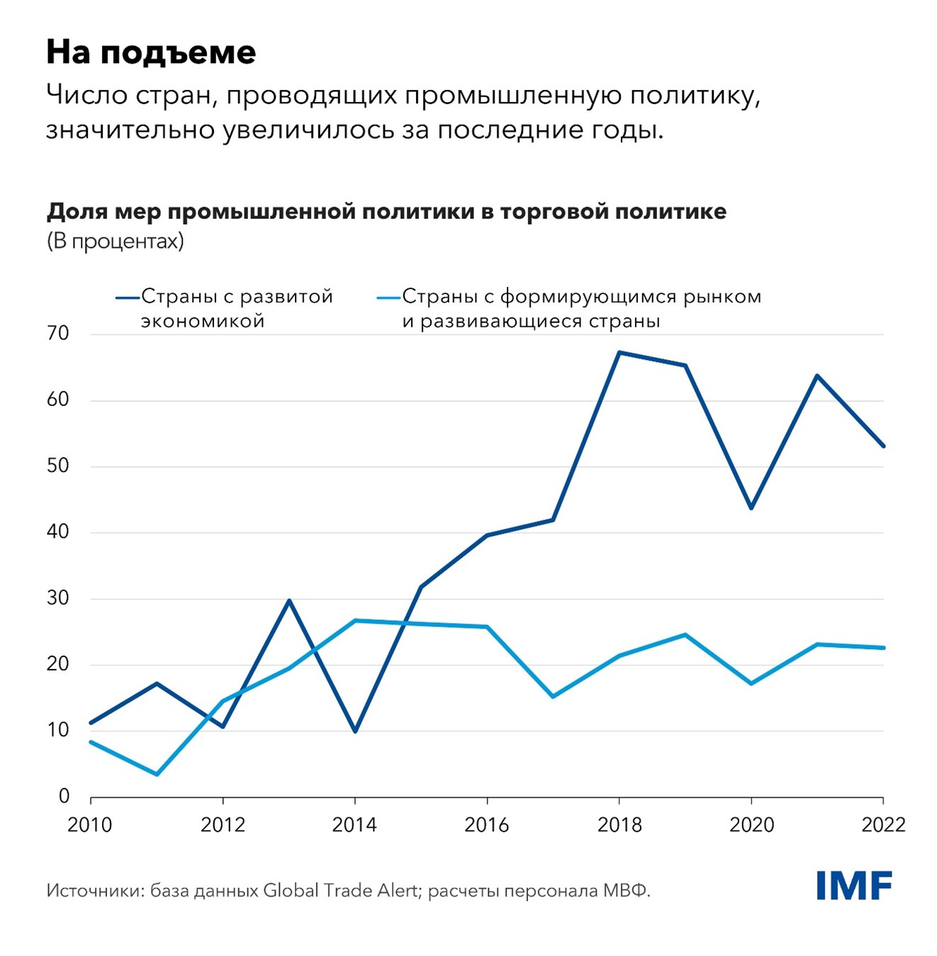 Многие страны все активнее применяют промышленную политику, направленную на стимулирование инноваций в конкретных секторах, в надежде ускорить производительность и долгосрочный рост на фоне соображений безопасности. Во всем мире возникают масштабные инициативы, такие как «Закон о чипах и науке» в США для финансирования исследований и производства полупроводников внутри страны, план промышленного развития «Зеленый курс» Европейского союза для содействия переходу блока к экономике, не оказывающей воздействия на климат, Новое направление экономики и промышленной политики в Японии или «Закон о K-чипах» в Корее, наряду с многолетней политикой в странах с формирующимся рынком, таких как Китай.