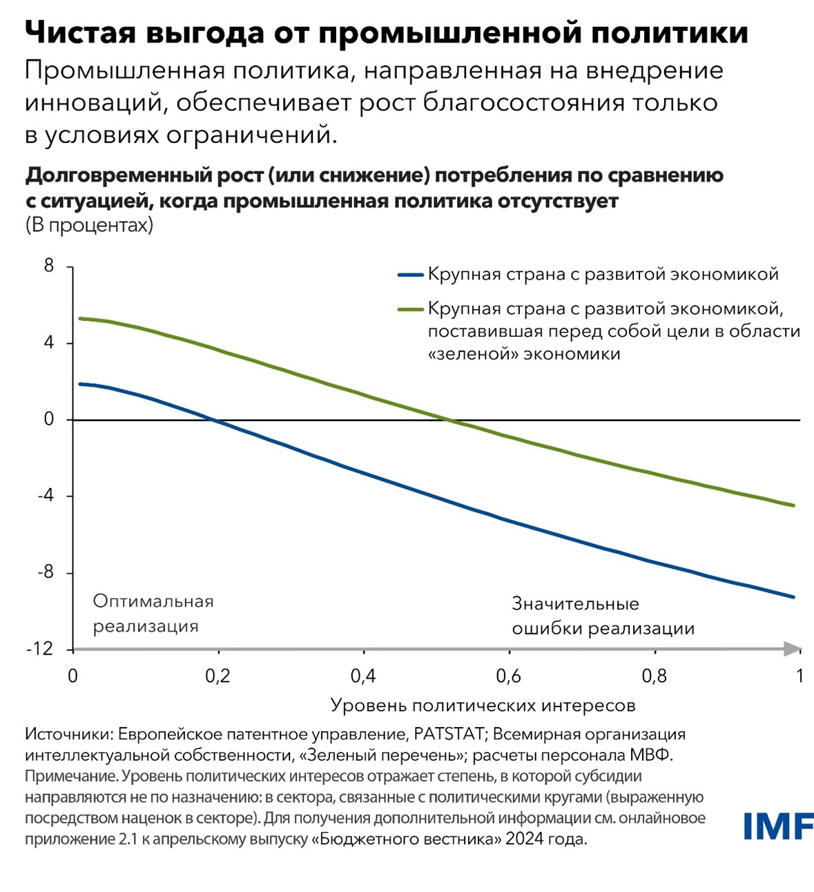 В некоторых случаях промышленная политика может быть оправдана: например, если она оказывает поддержку секторам, которые обеспечивают сильные вторичные эффекты в сфере знаний для национальной экономики (например, в полупроводниковой промышленности). Еще одним важным вариантом использования является стимулирование «зеленых» инноваций — для достижения нулевого чистого уровня выбросов потребуются технологии, которых еще не существует. Но субсидии на «зеленые» инновации должны быть прозрачными, ориентированными на экологические цели и дополняться продуманными тарифами на выбросы углерода для сведения к минимуму бюджетных издержек.