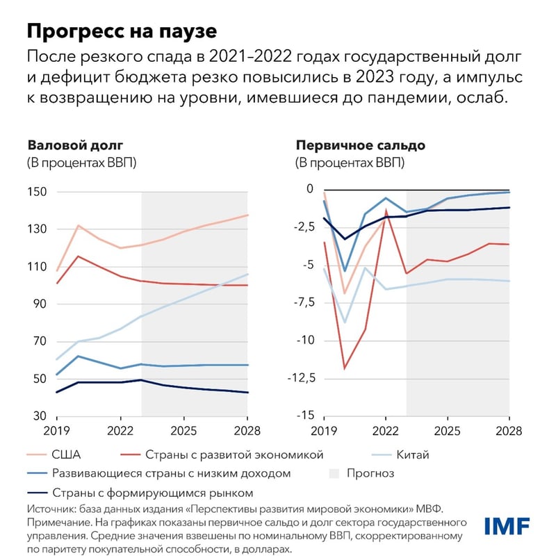 В 2023 году государственный долг в глобальном масштабе увеличился до 93 процентов ВВП, оставаясь на 9 процентных пунктов выше, чем до пандемии. Рост произошел в двух крупнейших экономиках, США и Китае, уровень долга в которых повысился более чем на 2 и 6 процентных пунктов ВВП соответственно.